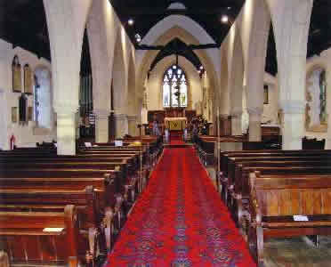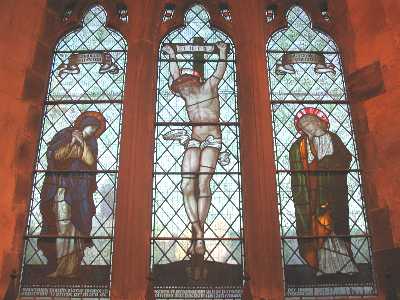 Within the building itself there are a number of points of interest. The east Window behind the altar features a stained glass picture of the Crucifixion depicting a beardless Christ.
